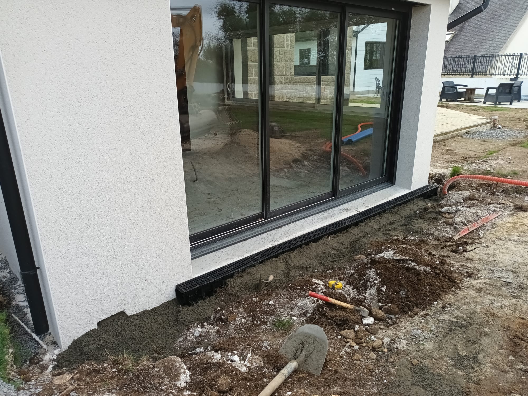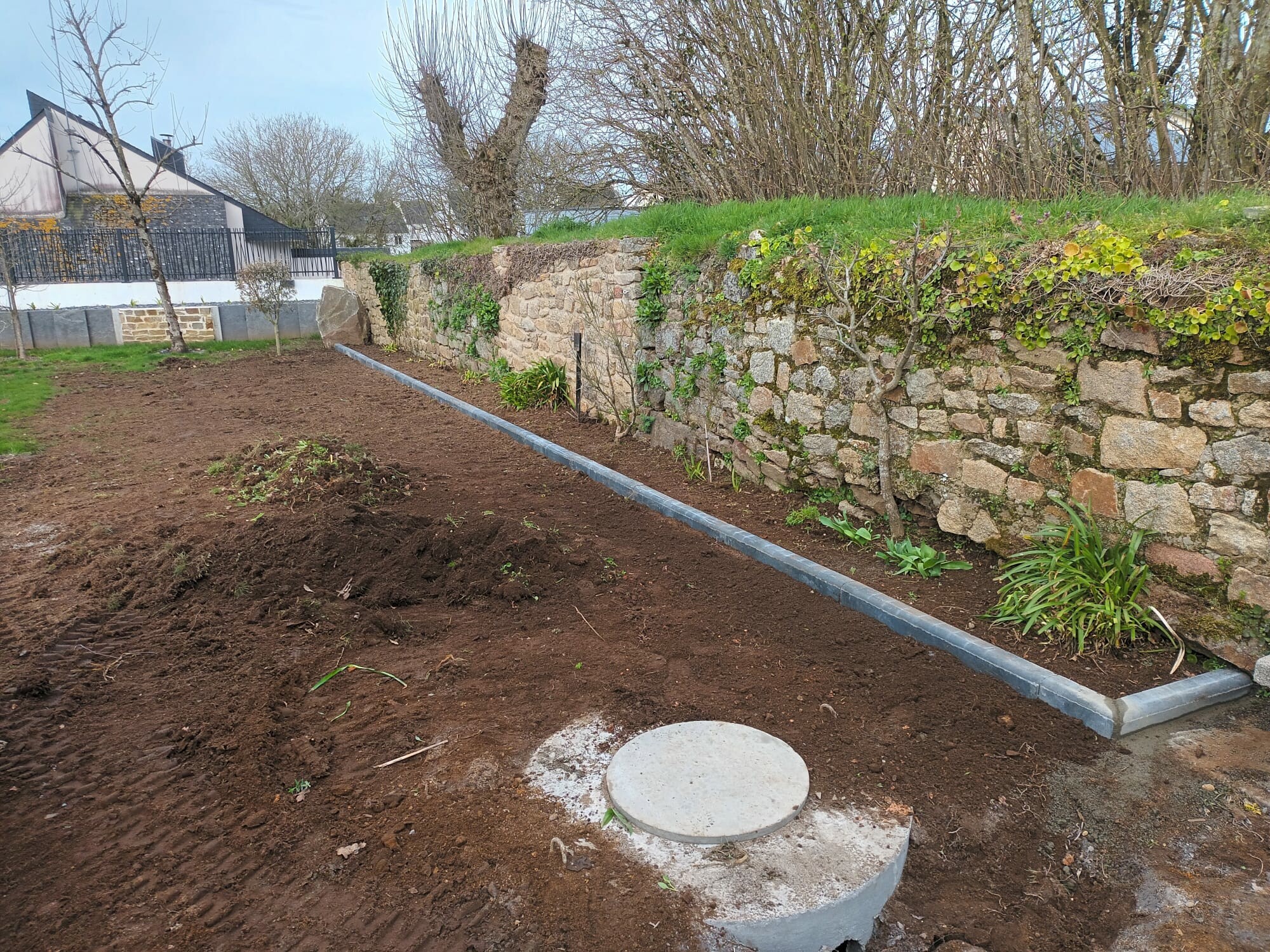 Plusieurs étapes pour un ré-aménagement extérieur : nivellement avec de la terre végétale, puis pose de bordures