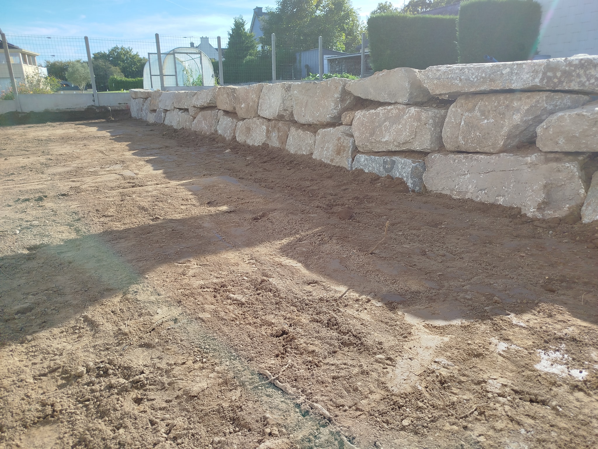 Assemblage d’un mur de soutènement en blocs de pierre massive, pour structurer le terrain et retenir la terre.