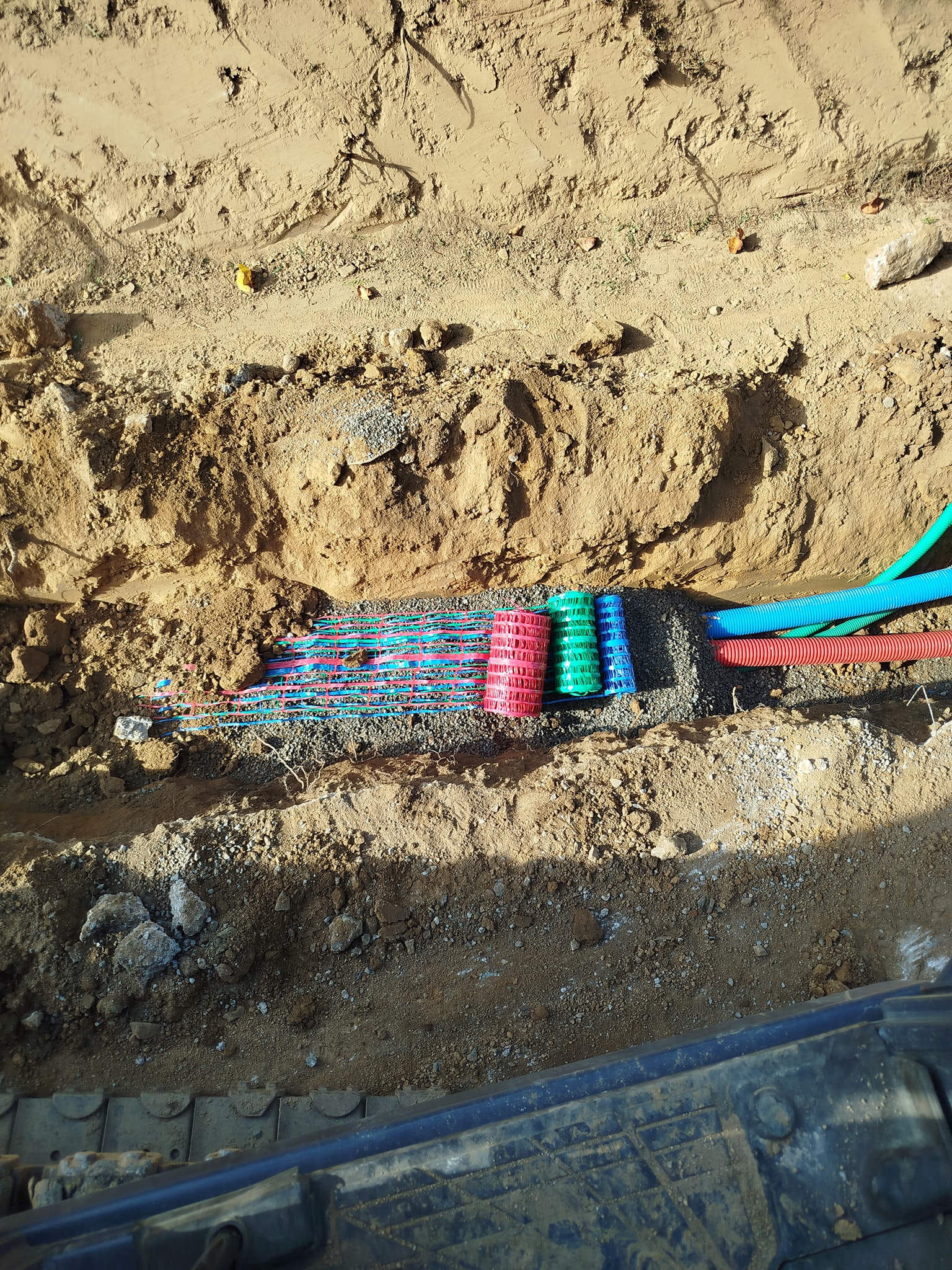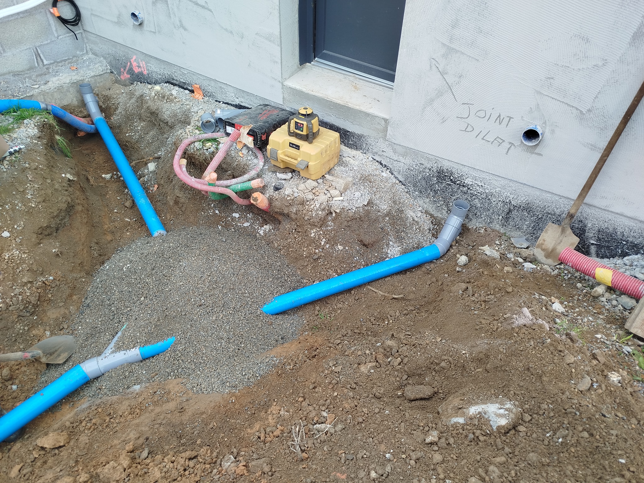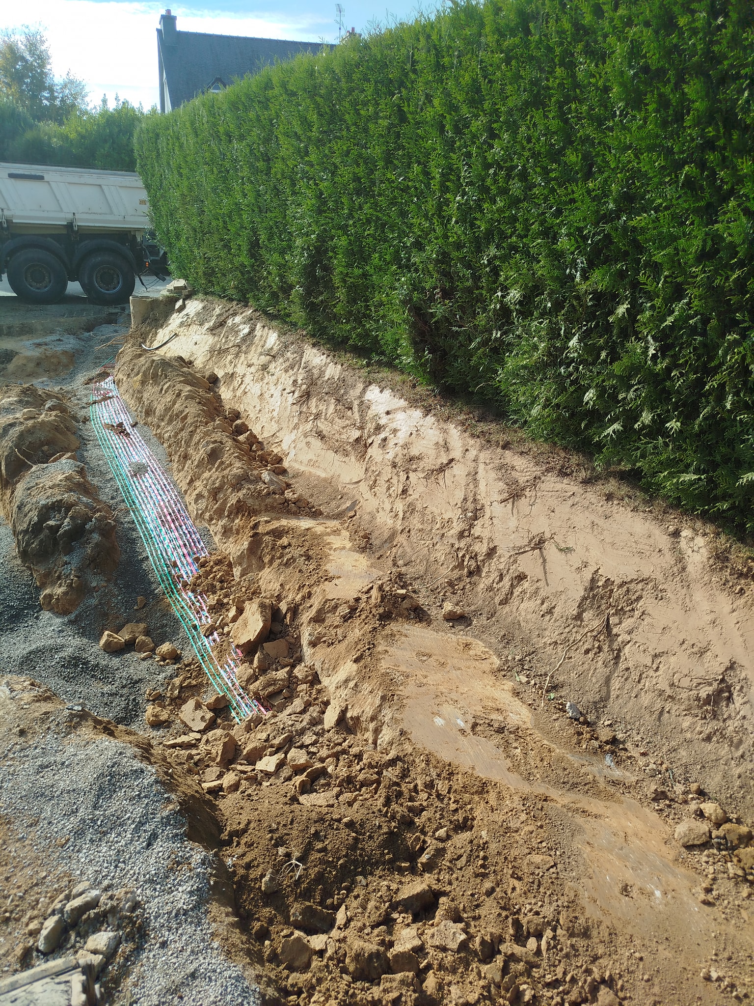 Pose des fourreaux techniques et raccordements (eau, électricité, évacuation) : chaque tranchée est creusée, protégée, puis remblayée au fur et à mesure.
