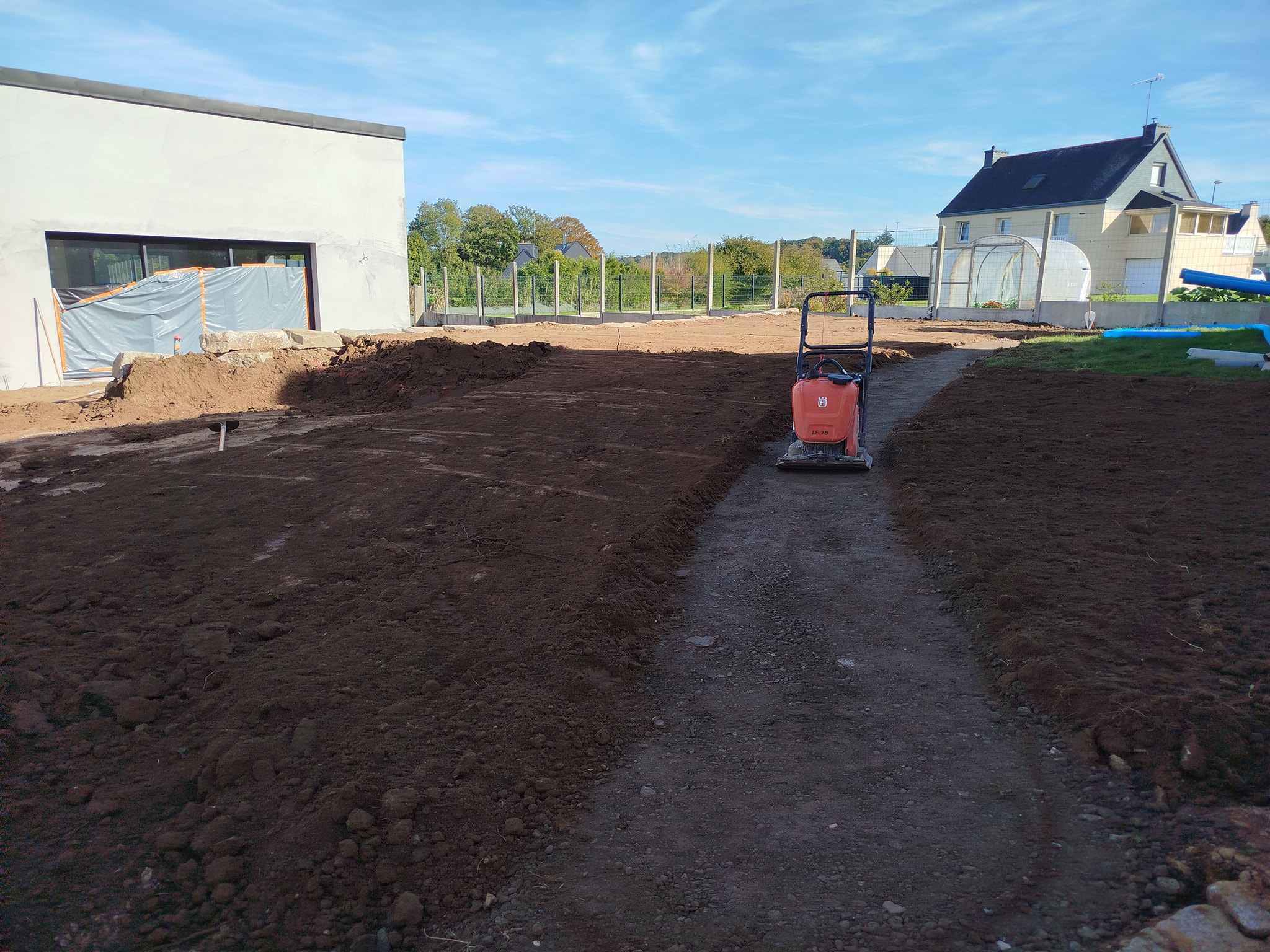 Travail de préparation de la plateforme avant engazonnement ou autre aménagement paysager. Le sol est repris sur l’ensemble de la surface pour assurer une finition propre et plane.
