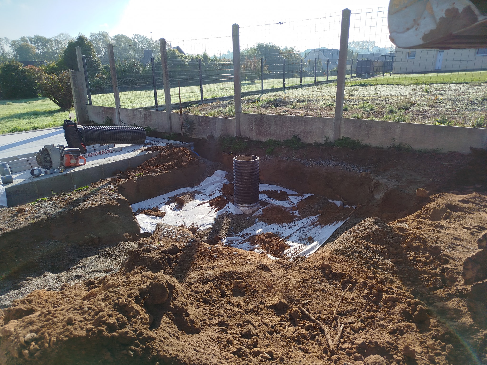 Création du système d'infiltration des eaux pluviales : terrassement, pose du géotextile, apport de gravier et mise en place du regard. Une étape essentielle pour garantir la pérennité des extérieurs.